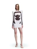 Black and white short fitted dress with semi-transparent mesh inserts, adorned with futuristic details reminiscent of technological forms and architecture. Contrasting lines, dynamic composition, modern graphic style, focus on structure and innovative design.