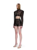 Cropped jacket made of dense textured mesh. Long sleeves and sharply structured shoulders add graphic and modern architectural character. The silhouette is clean and minimal, emphasizing the structure and material.