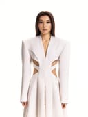 Floor-length dress with a deep central slit, bold broad shoulders, and striking cutouts at the waist. Focus on architectural shapes, clean lines, a balance of structure and dynamism, evoking an aura of contemporary elegance and confidence.